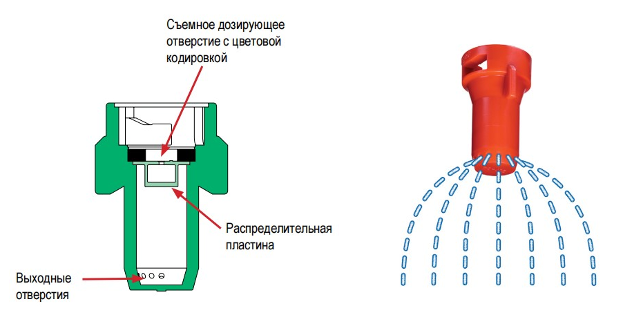 - широкий и стабильный «зонтичный» факел распыла с выходными отверстиями, направленными перпендикулярно поверхности почвы;
