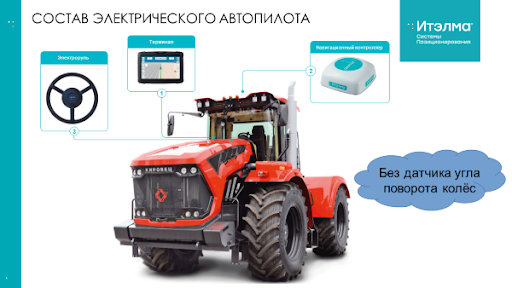 - Электрический автопилот — электропривод на руль, терминал с ПО «ИТЭЛМА Агро Драйв», навигационный контроллер.